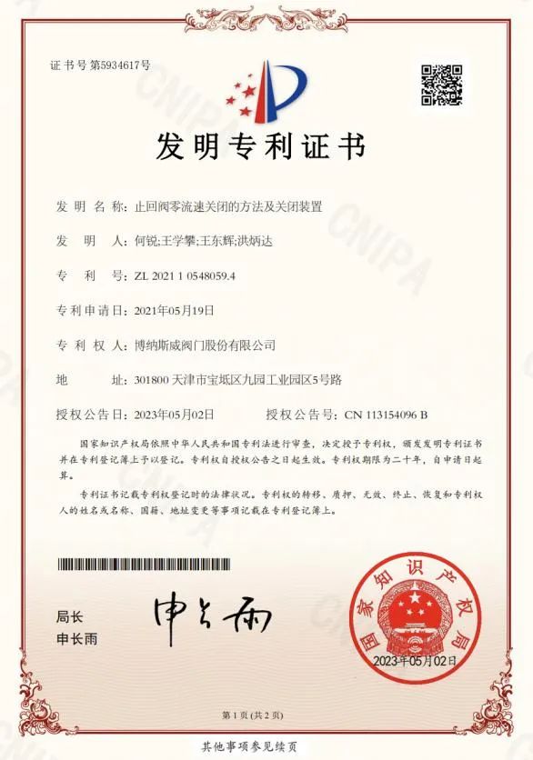 博納斯威閥門股份有限公司持續(xù)創(chuàng)新,2023年5月2日,博納斯威原創(chuàng)新技術(shù)“止回閥零流速關(guān)閉的方法及裝置”獲得國家知識產(chǎn)權(quán)局授權(quán)發(fā)明專利。迄今為止,博納斯威獲得專利總數(shù)量達到250項,其中發(fā)明專利16項,實用新型專利171項,外觀專利63項,成為專利高產(chǎn)閥門企業(yè)。