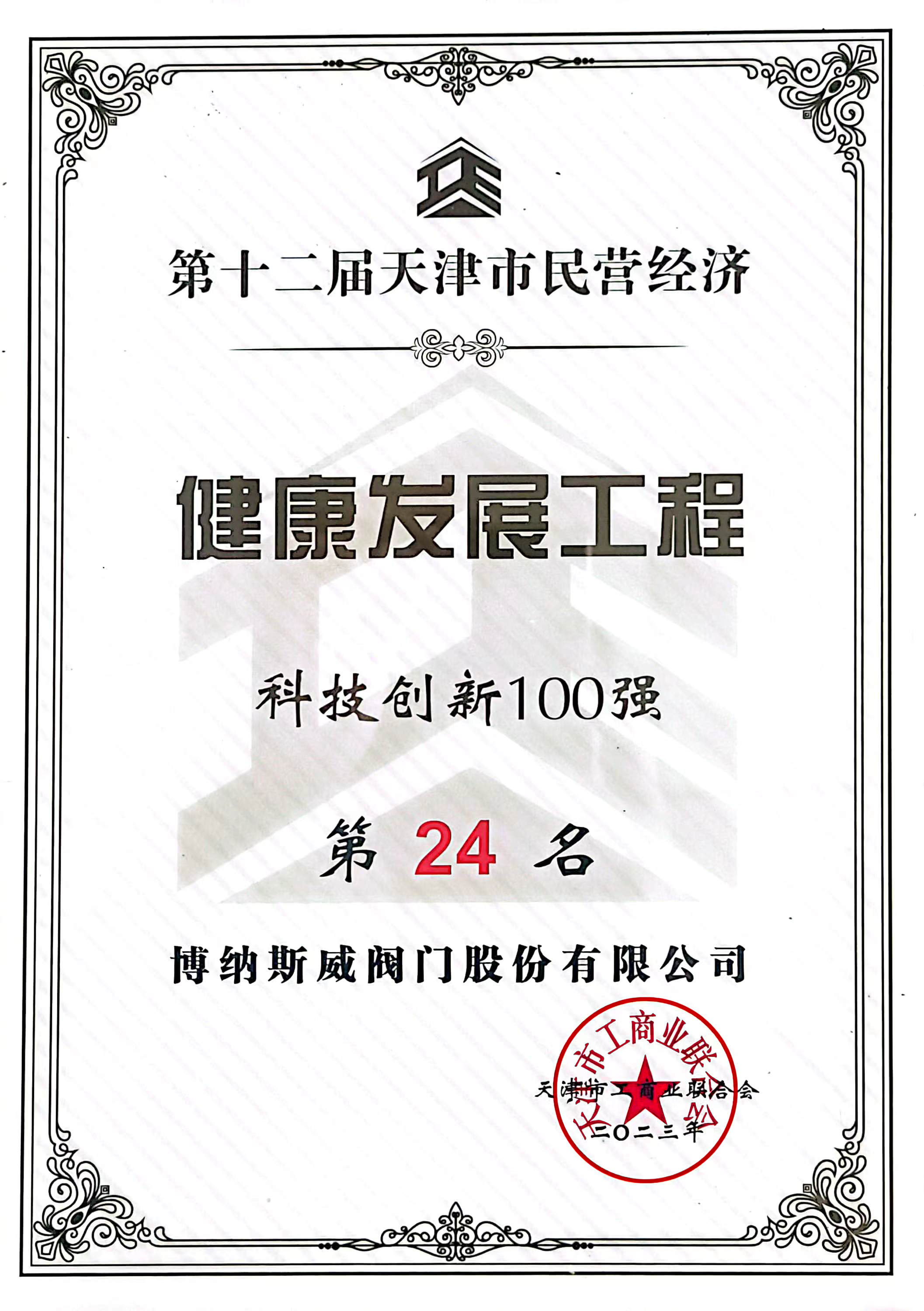 近日,由天津市人民政府、科學(xué)技術(shù)部、全國工商聯(lián)共同主辦的2023中國民營企業(yè)投融資洽談會(huì)在天津隆重開幕。開幕式期間,舉行了第十二屆天津市民營經(jīng)濟(jì)健康發(fā)展工程發(fā)布會(huì),共發(fā)布五項(xiàng)榜單,博納斯威閥門股份有限公司榮列科技創(chuàng)新百強(qiáng)第24名。