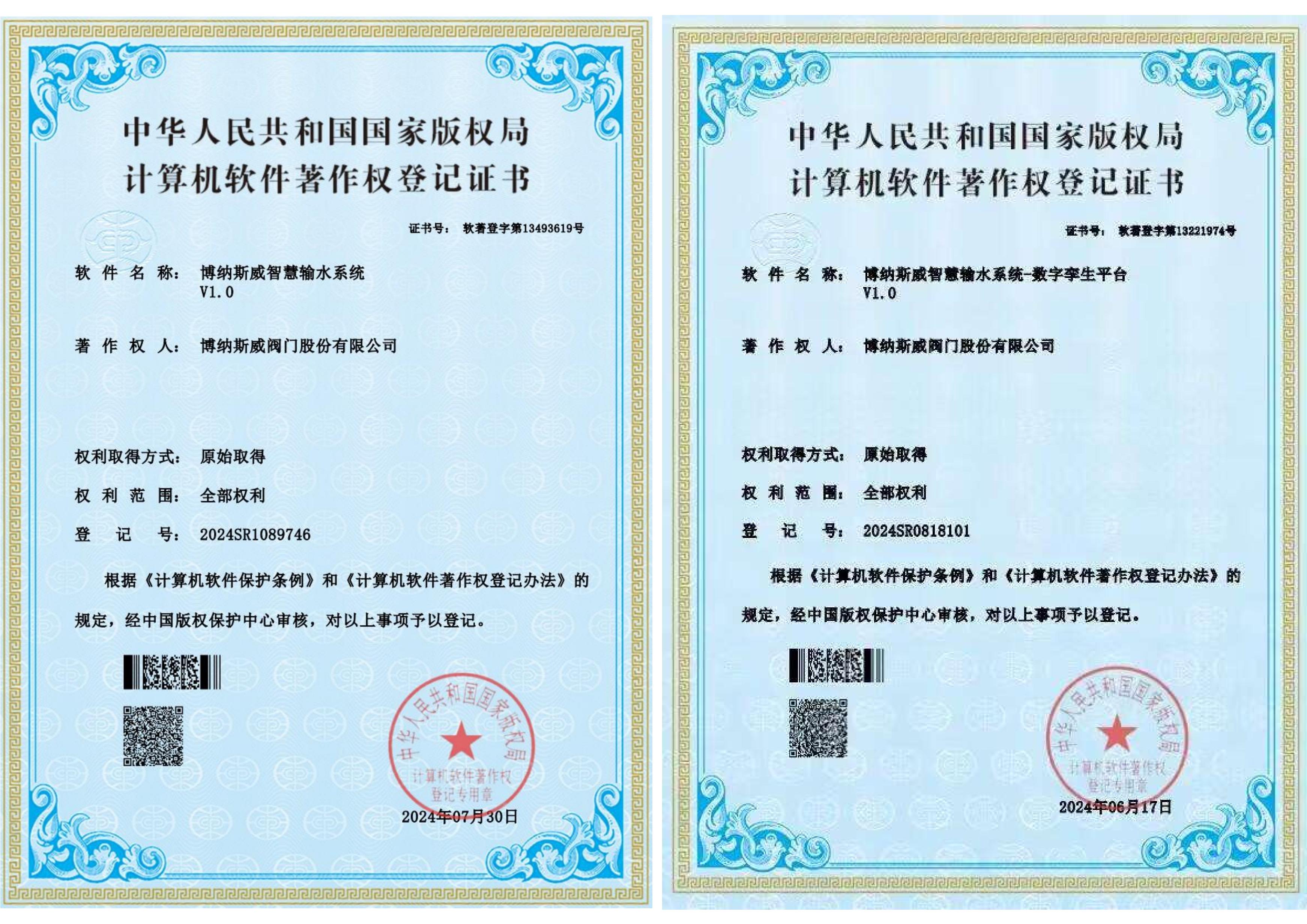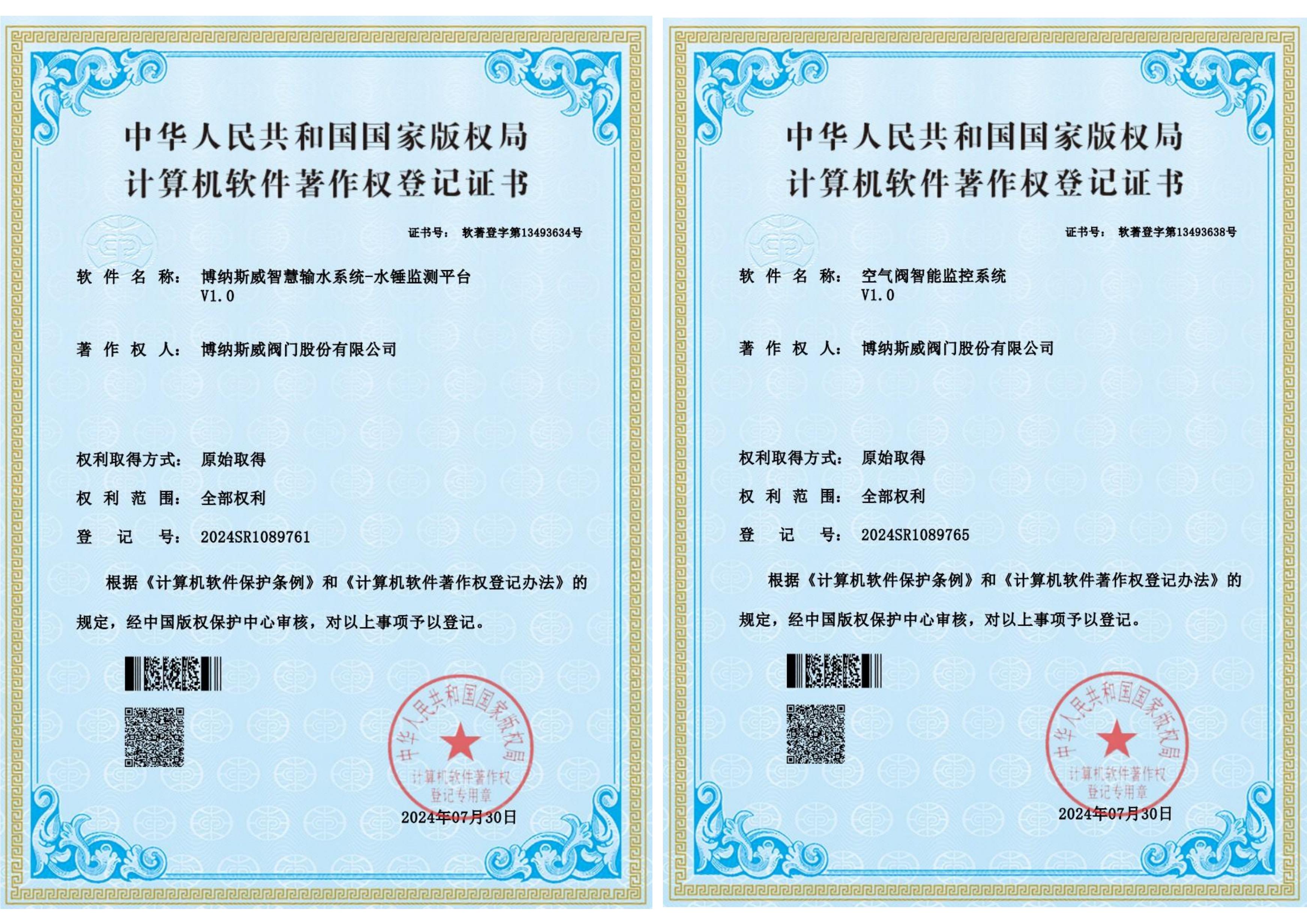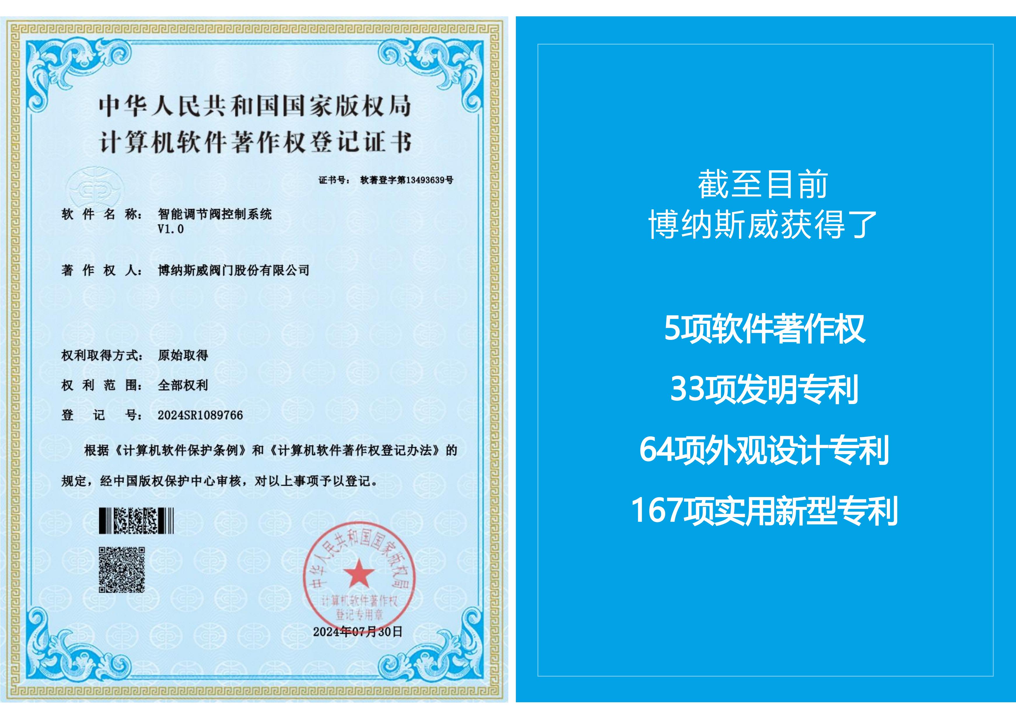 博納斯威閥門股份有限公司在創(chuàng)新領(lǐng)域進(jìn)入了高速發(fā)展階段,2024年公司取得了豐碩成績,成功獲得了五項(xiàng)軟件著作權(quán)與六項(xiàng)發(fā)明專利。